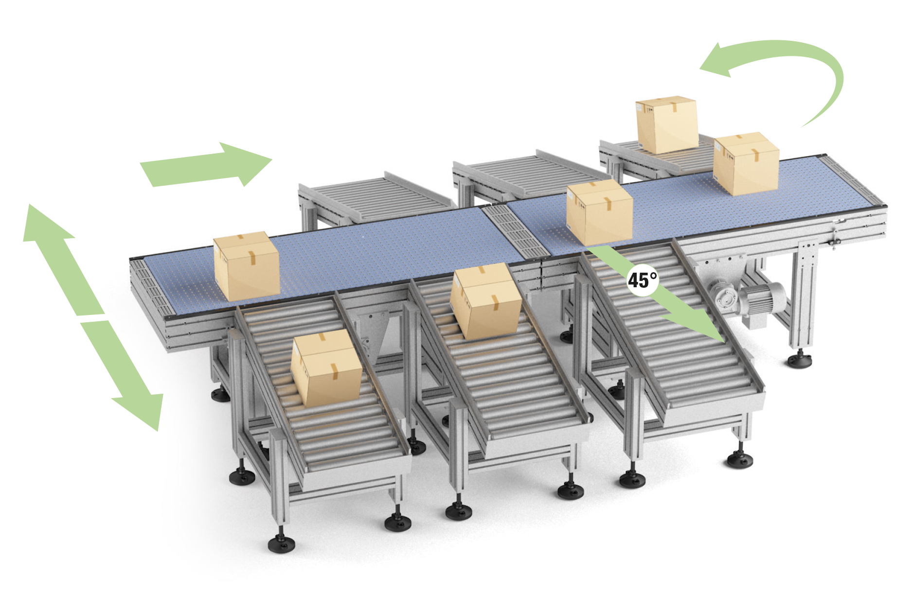 Il sistema sfrutta nastri e piastre interne per controllare il movimento dei prodotti. Questo permette diverse applicazioni: