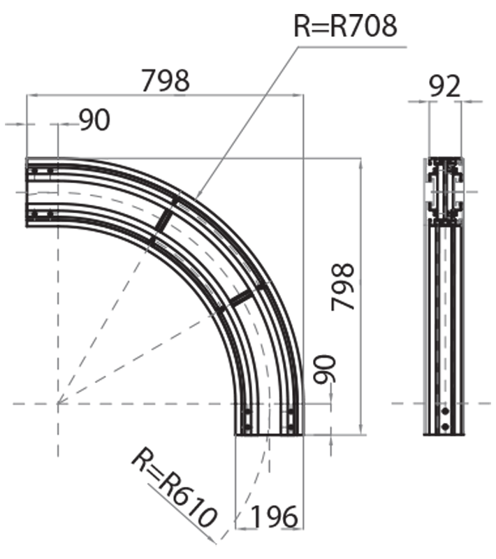 Return 90° sliding curve average radius 610 mm