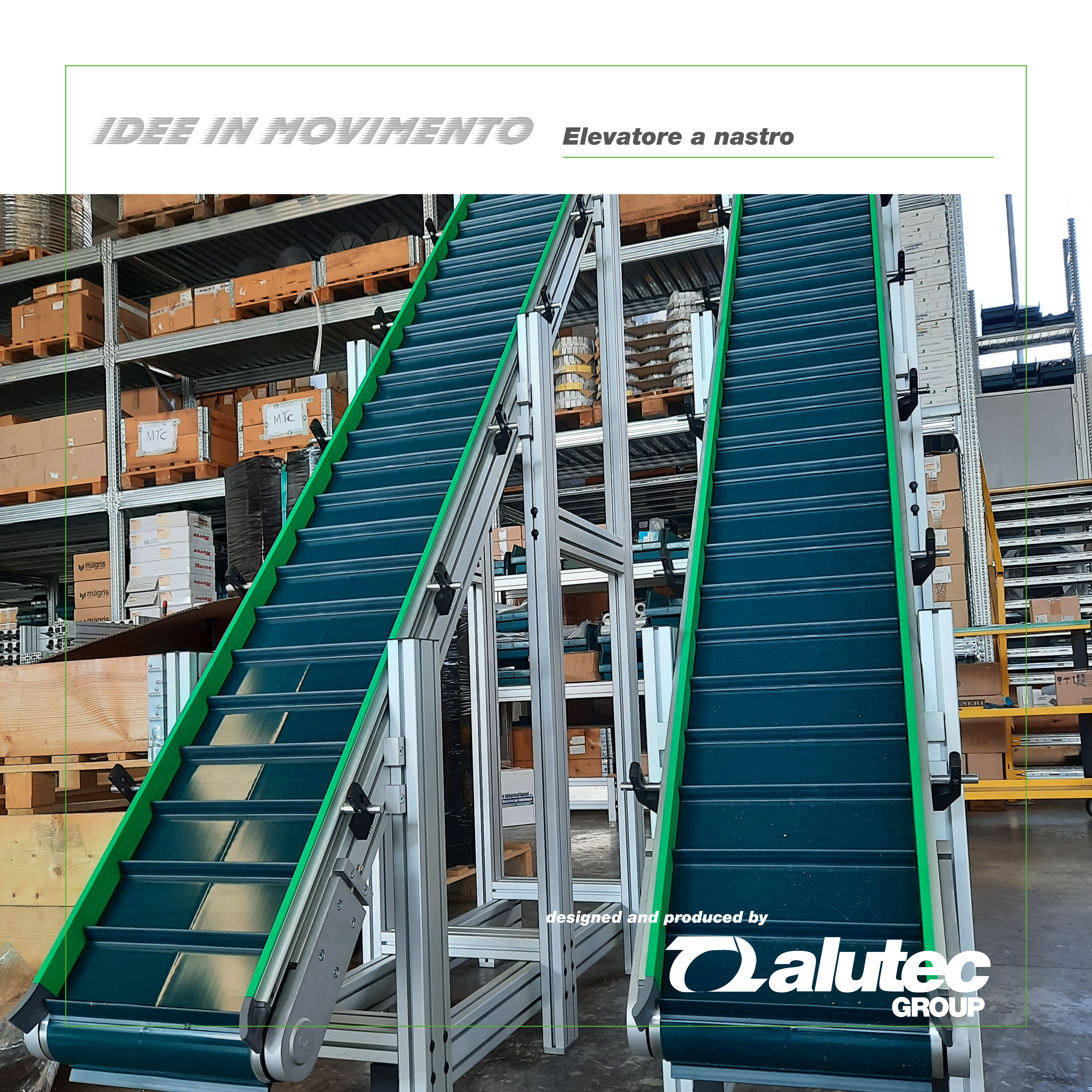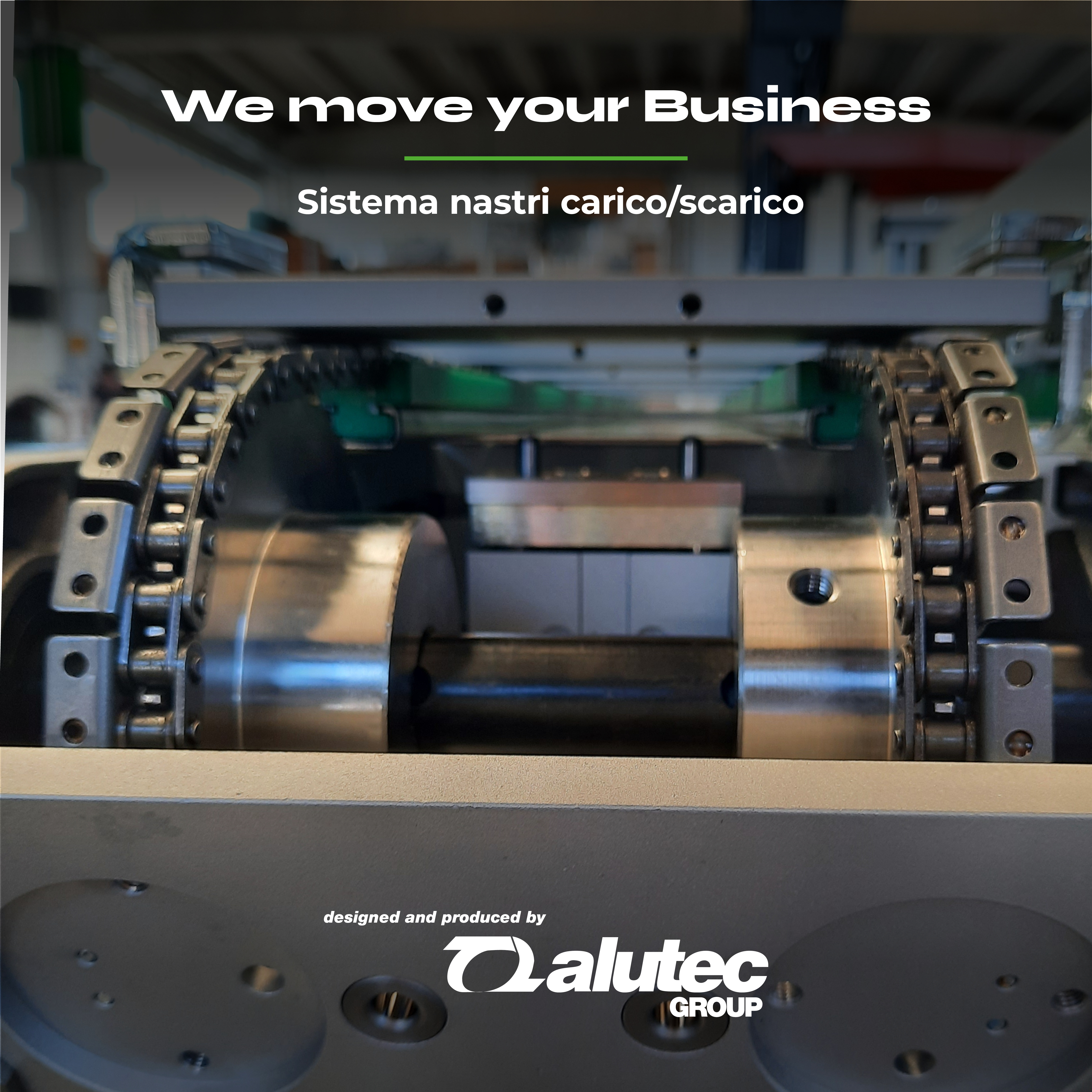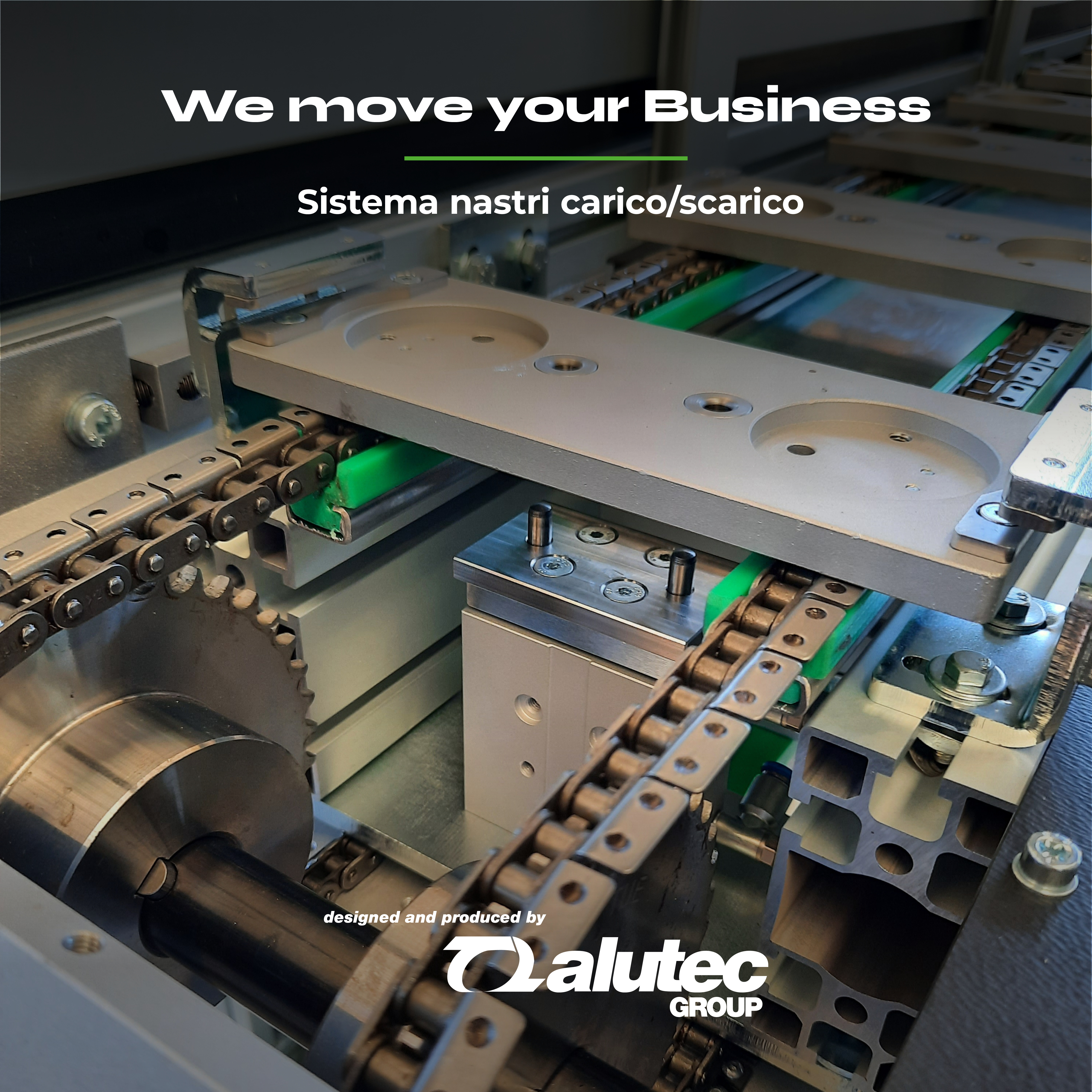 The machine was designed according to specific customer requirements, to convey products with predefined and constant dimensions. The products are cylindrical elements with a diameter of approximately 50 mm. They are received at the rear of the loading conveyor: in particular, a robot implemented by the customer positions them on aluminium pallets attached to chain links. In two specific positions, the pallets are stopped and centred by pneumatic cylinders placed under the belt, equipped with centring tips. At the end of the loading conveyor, the products are picked up by the robot and released onto the discharge conveyor chute, in two different lanes according to quality criteria The machine is equipped with wheels for manual insertion and extraction into an existing system, with a tilting system that raises the front pair of wheels. A locking knob ensures the stability of the tilting system.