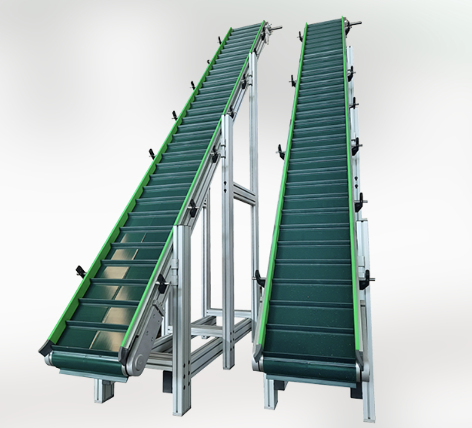 Die Bänder sind mit Stegelementen (Cleats) ausgestattet, um ein Verrutschen der Teile während des vertikalen Transports zu verhindern.