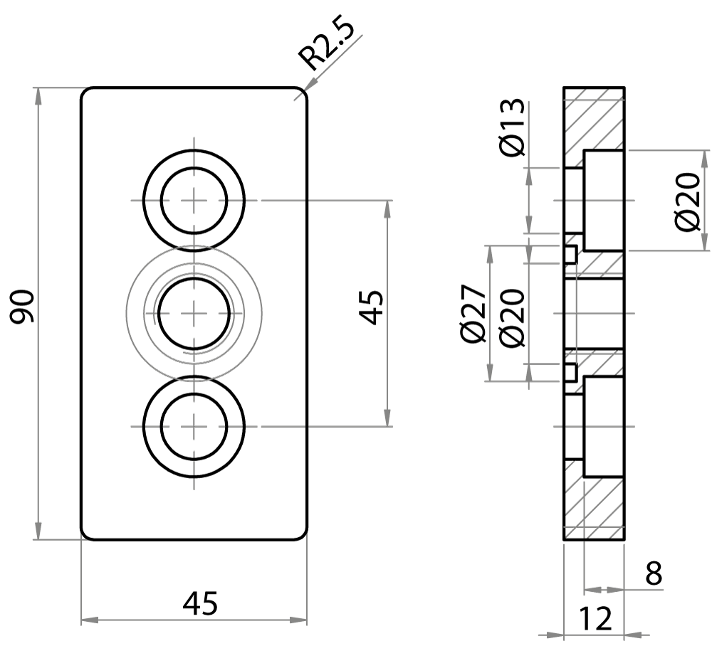 52459212 - Flangia di fissaggio 45x90 per profili cava 10 mm serie 45 / Flange di fissaggio per piedi e ruote / Accessori di sostegno / Prodotti / Alutec | Profili in alluminio, sistemi di trasporto e automazione industriale - Alutec Group
