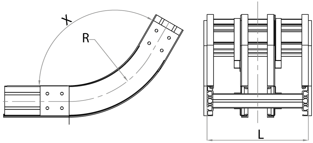 | Raggio di curvatura R (mm) | Angolo di curvatura X (mm) | Larghezza canale L (mm) |