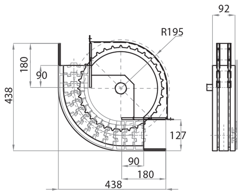 | Riferimento | Dimensione canale (mm) | Larghezza catena (mm) | Raggio medio (mm) | Angolo |