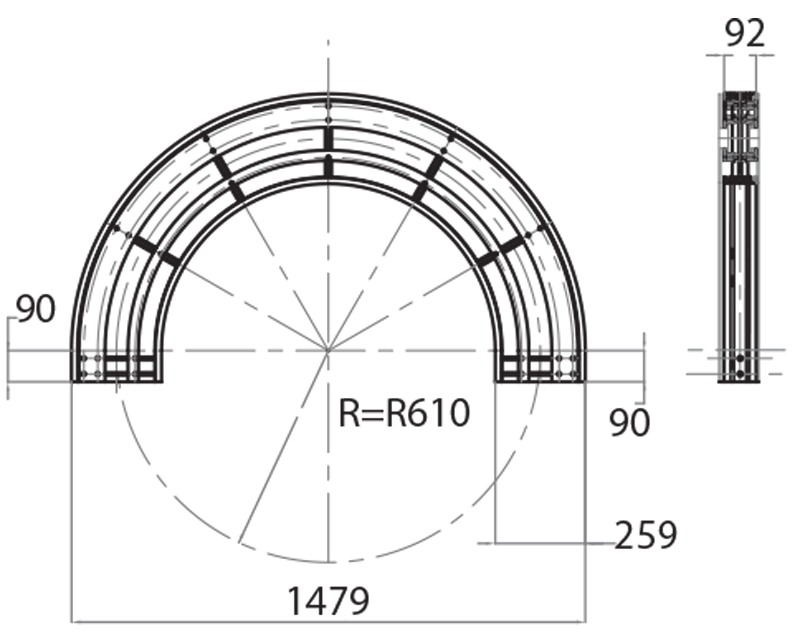 Curva 180° a strisciamento (andata e ritorno) r medio=610 mm